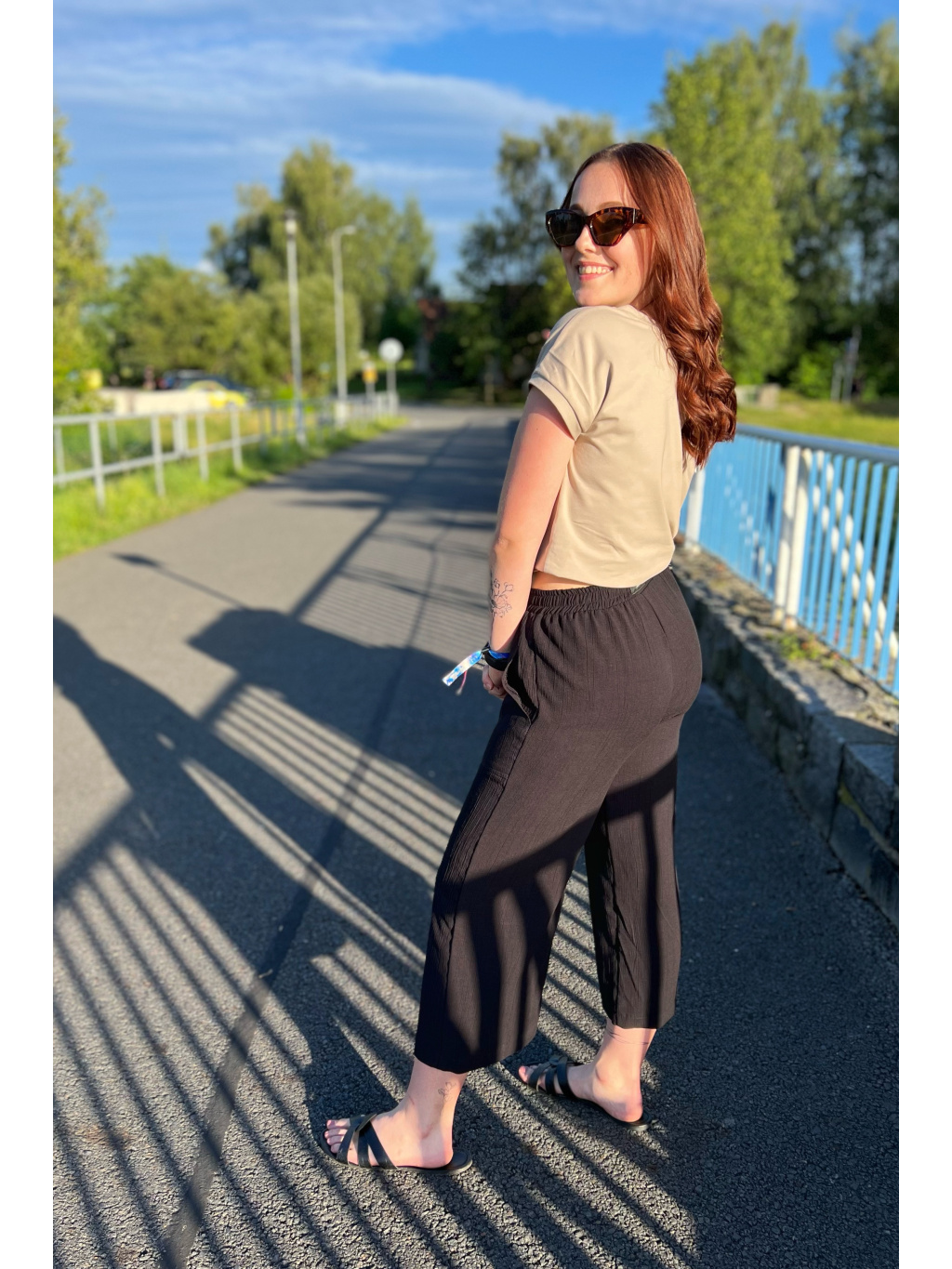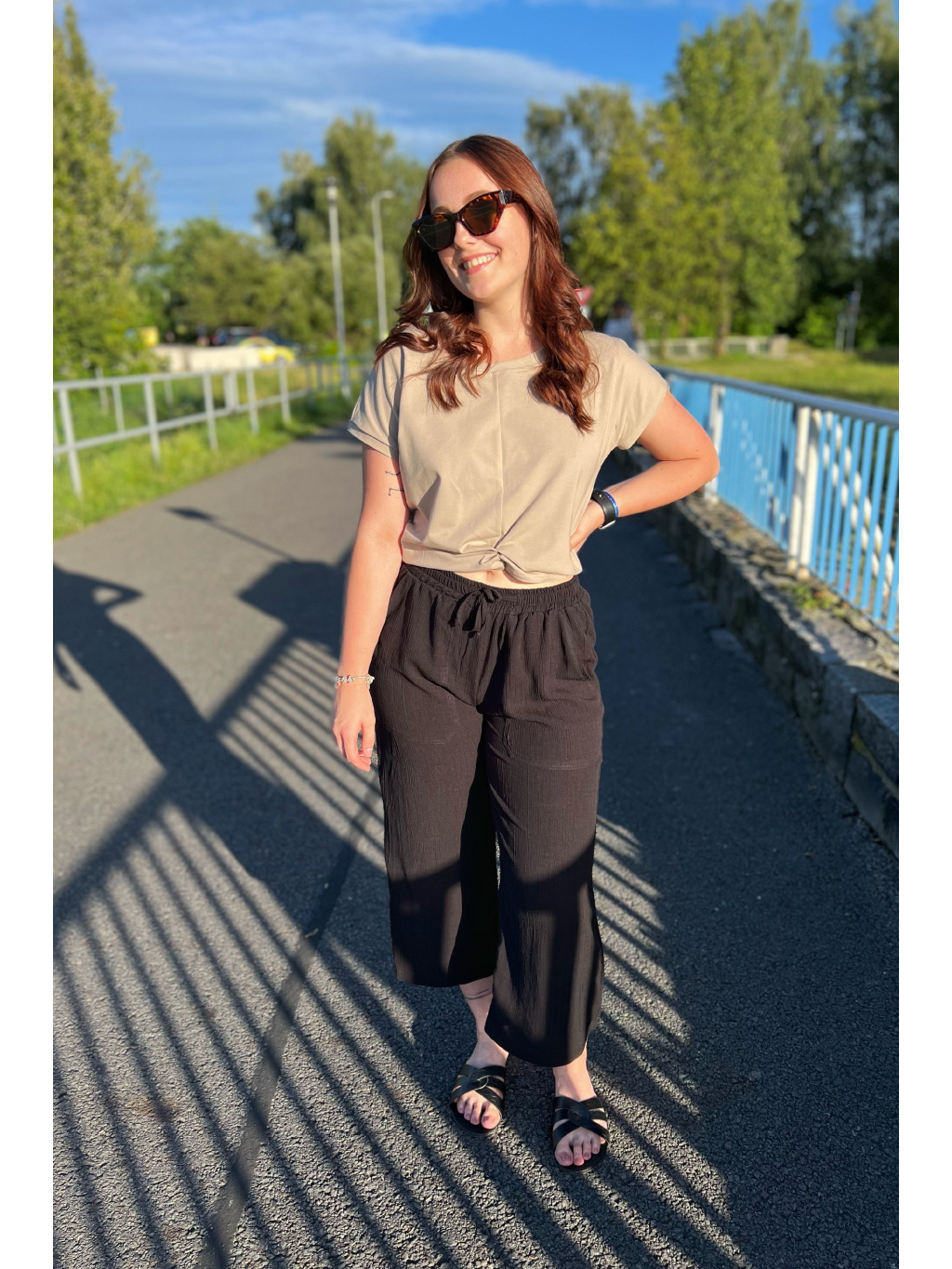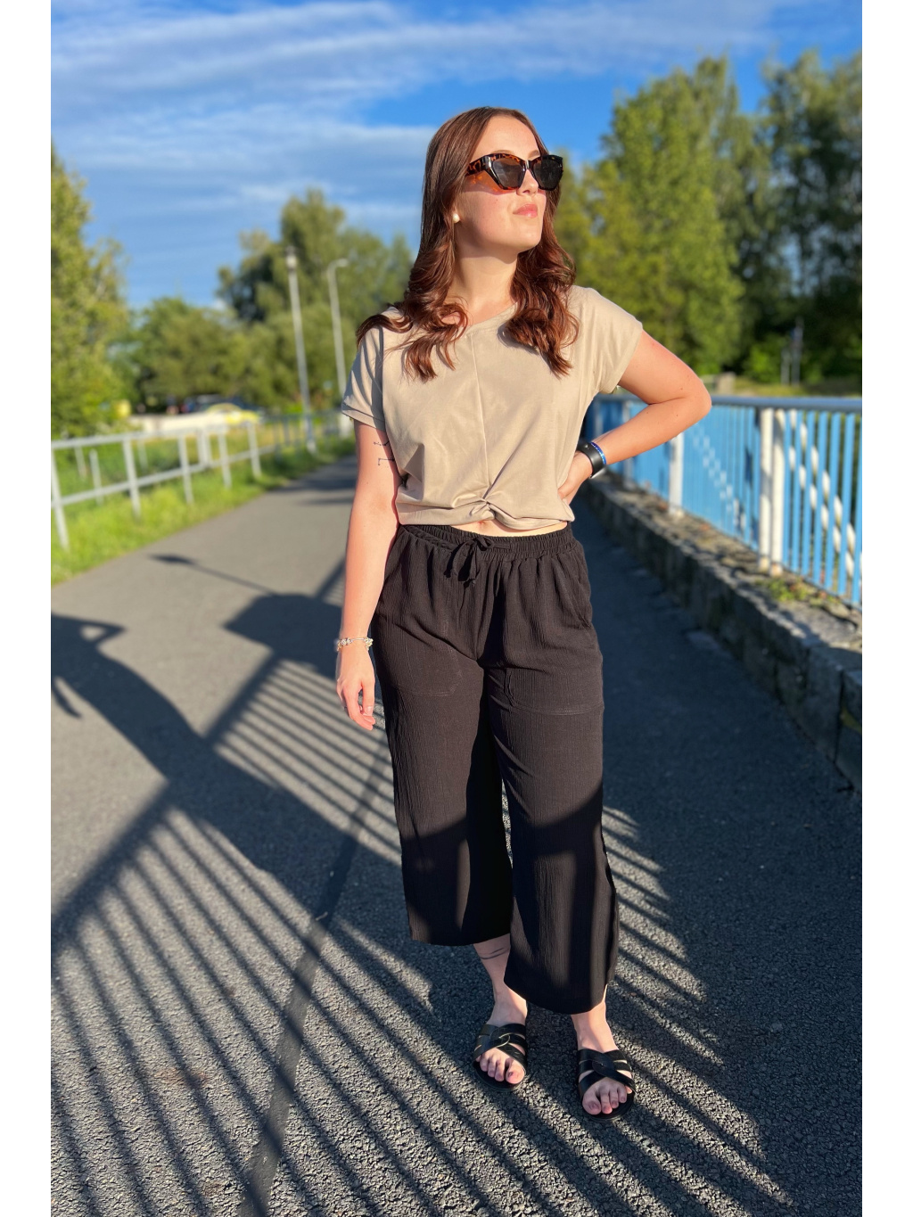 Modelka na sobě má v dlouhé verzi vel. S, délka 103cm a pas 34cm a cullotes S pas 34cm, delka 86cm. Díky pružné gumě v pase a šňůrkám se nemusíte bát, že by Vám kalhoty nesedly.