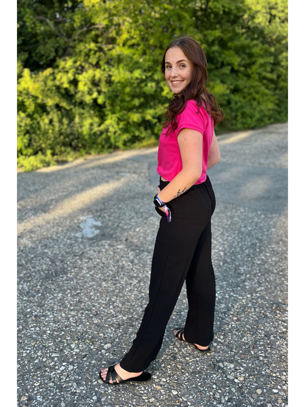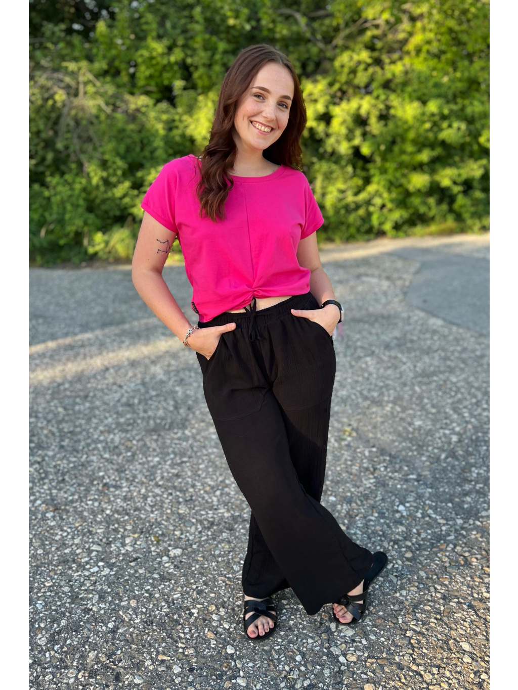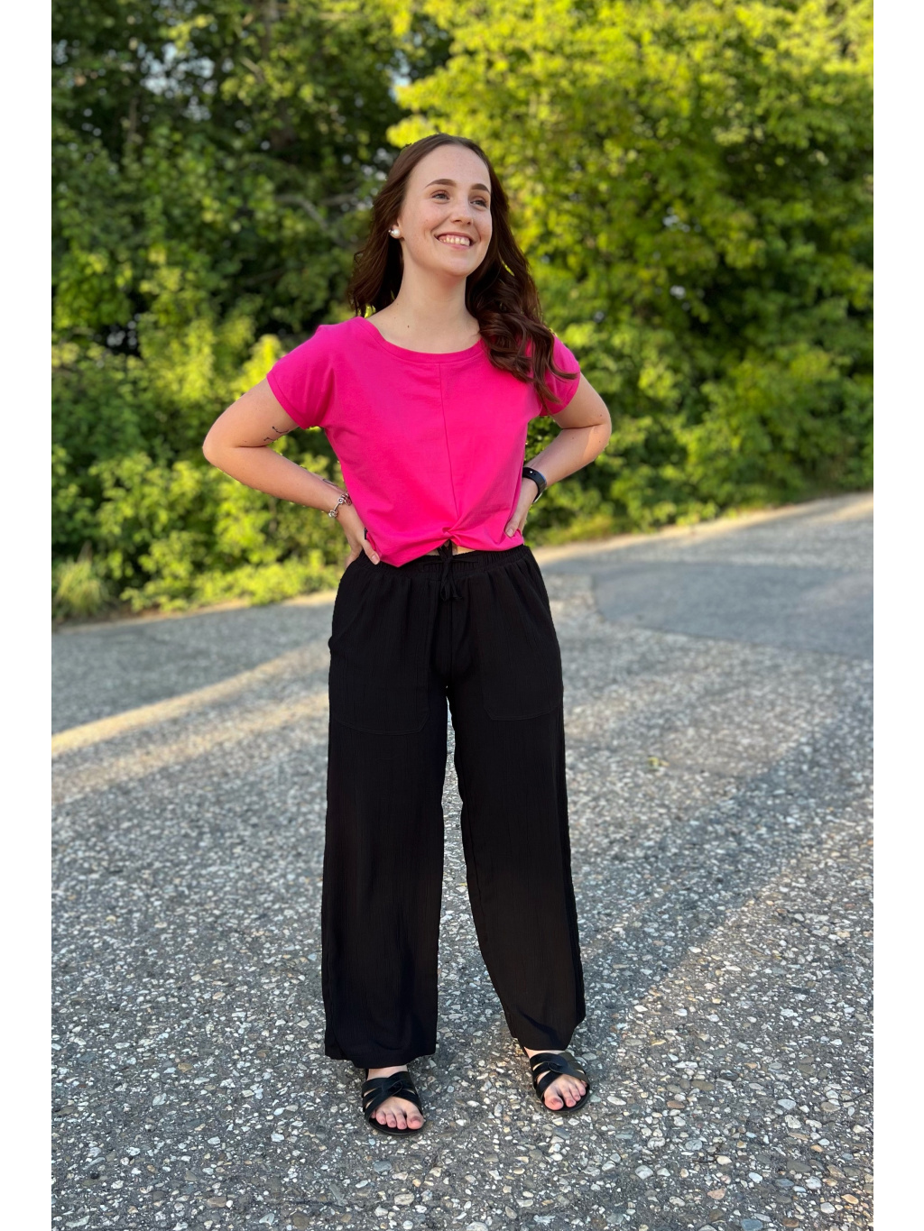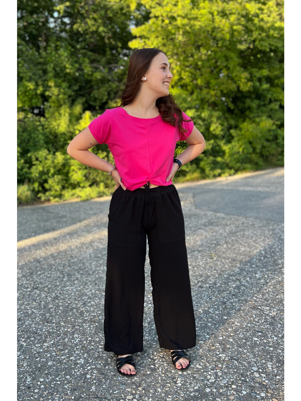 Modelka na sobě má v dlouhé verzi vel. S, délka 103cm a pas 34cm a cullotes S pas 34cm, delka 86cm. Díky pružné gumě v pase a šňůrkám se nemusíte bát, že by Vám kalhoty nesedly.