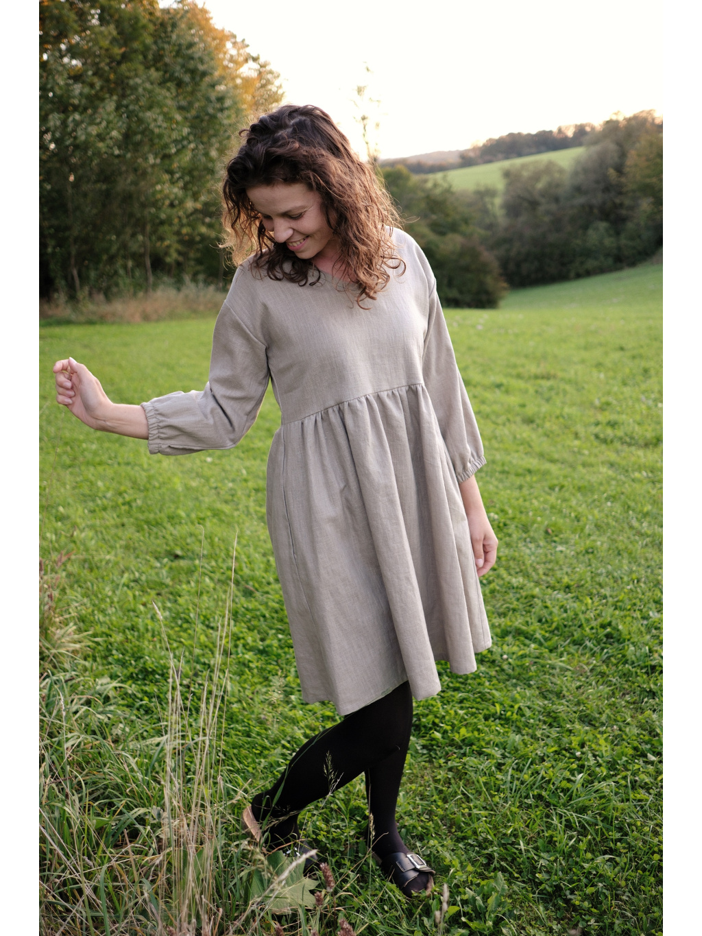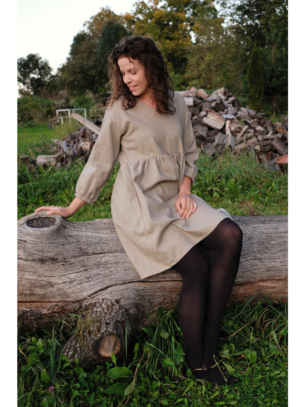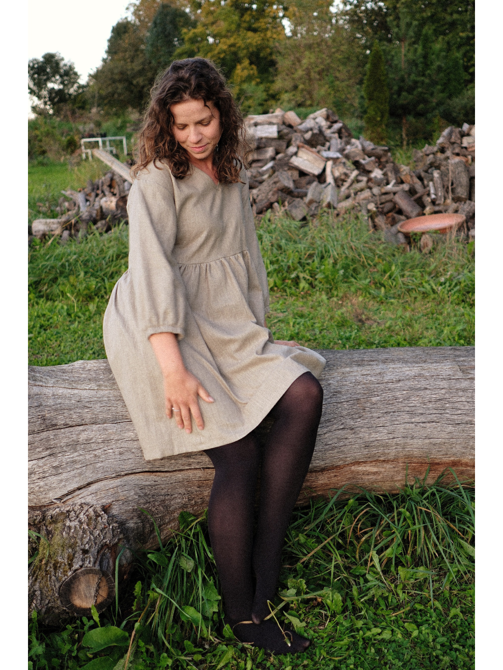 Lněné šaty Eleanor v harmonii s přírodou. Jejich béžový odstín podtrhuje jejich nadčasovost a snadnou kombinovatelnost s dalším oblečením a doplňky.