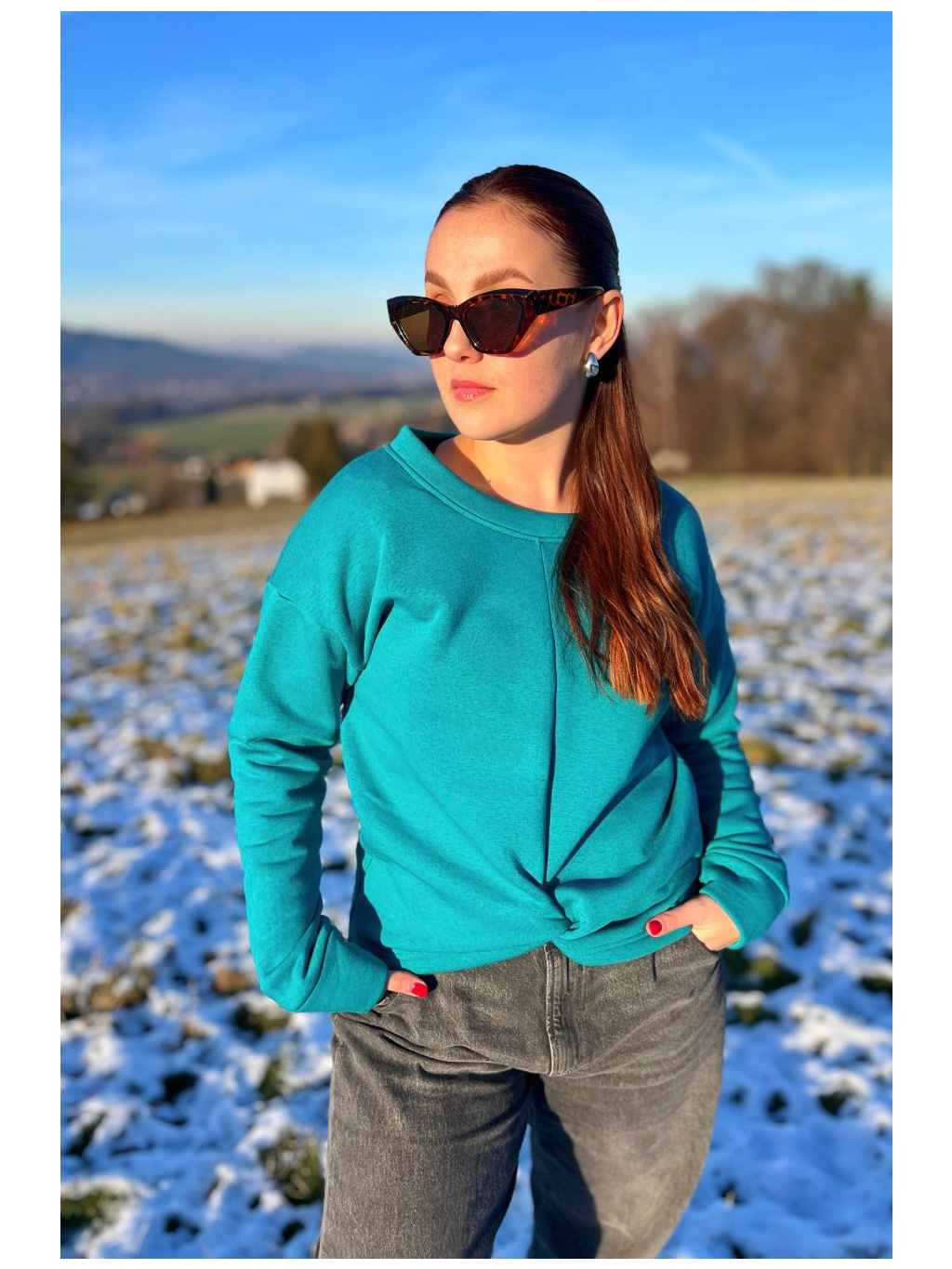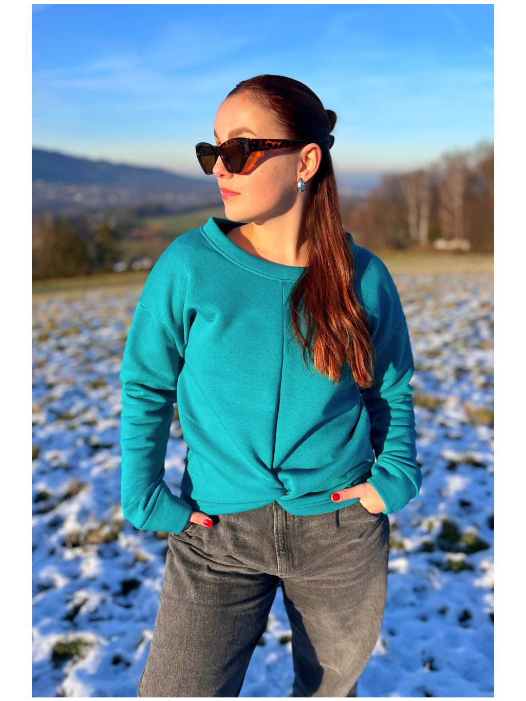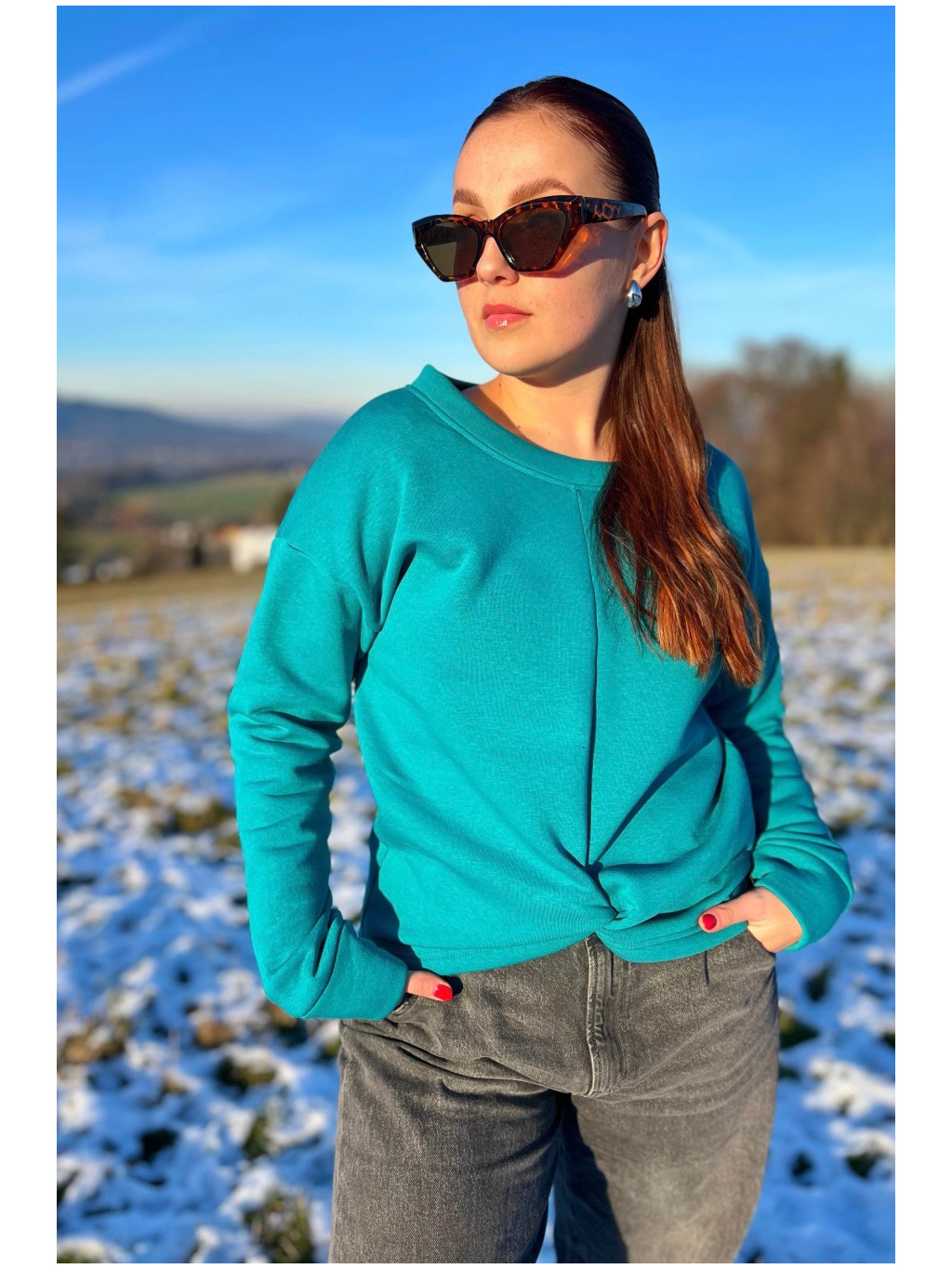 Střih zůstává pohodlný a lichotivý – přes prsa je volnější, směrem k pasu se lehce zužuje. Spadnuté rukávy a originální přední propletení dodávají mikině jedinečný charakter.