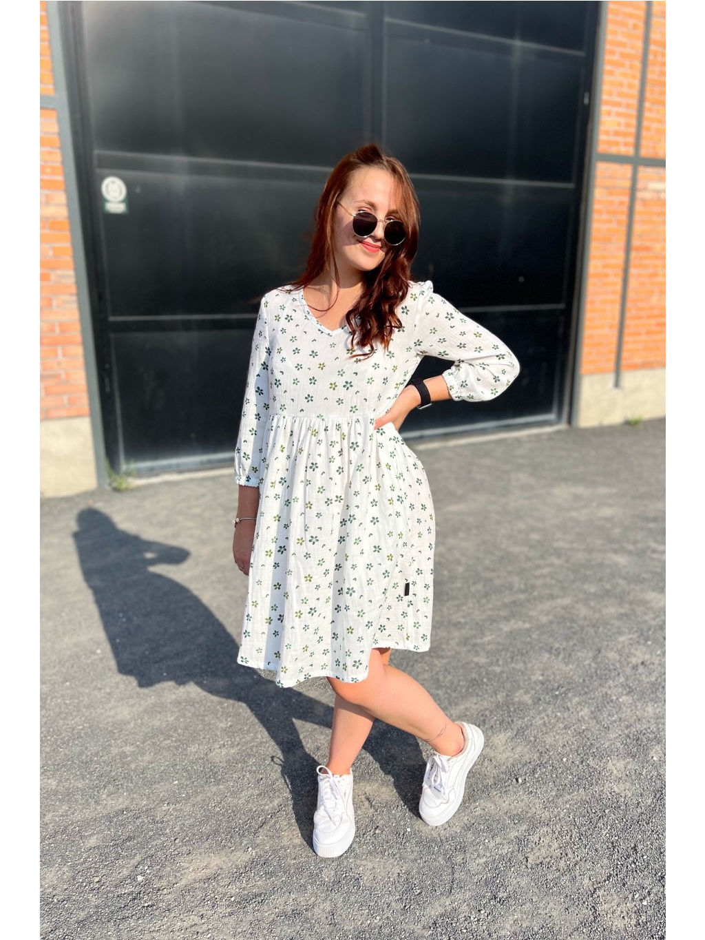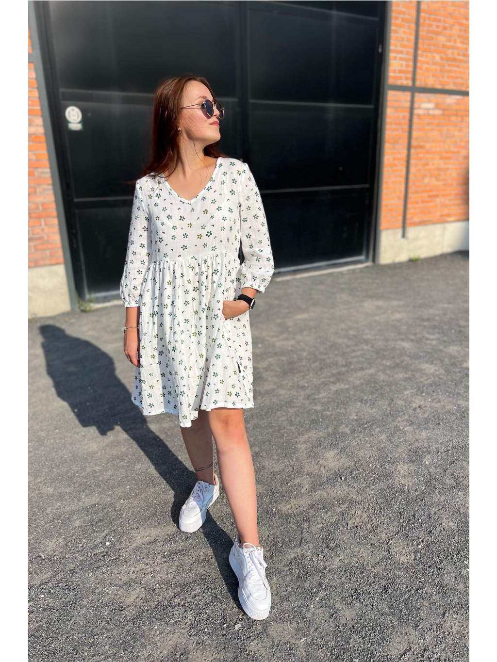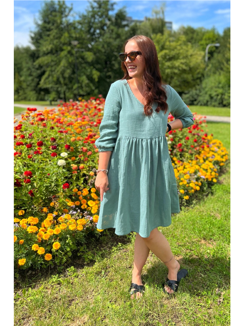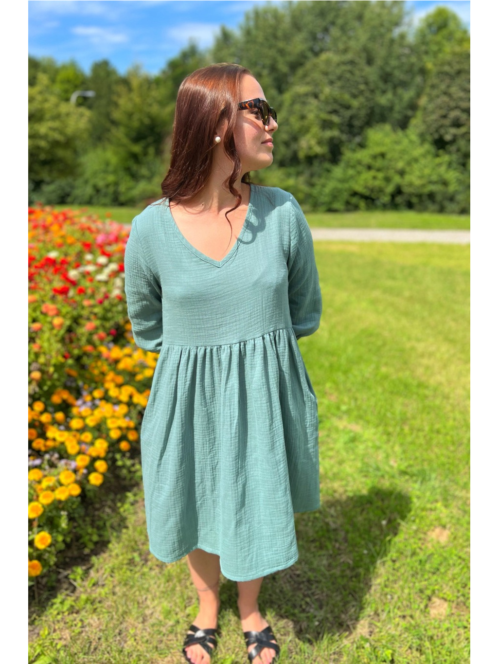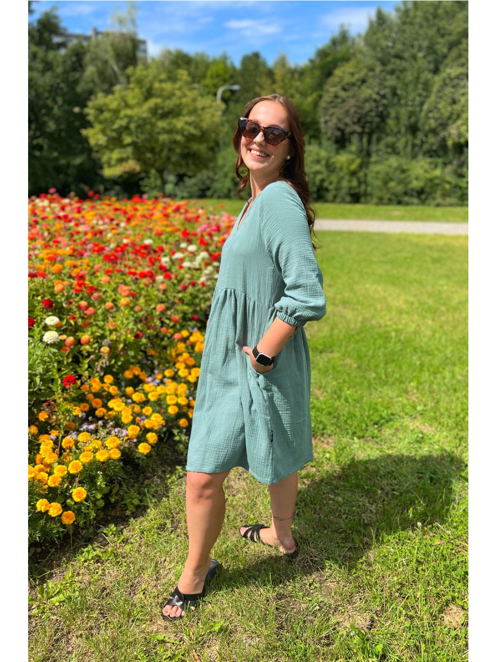 Naše mušelínové šaty jsou láska na první pohled . Dotek materiálu Vám to jen potvrdí, je lehoučký, vzdušný a opravdu neskutečně příjemný, pro léto jako dělaný. Tentokrát jsem volila výstřih do V, který k tomuto střihu šatů sedl parádně. Nezapomněla jsem ani na oblíbené kapsy.
