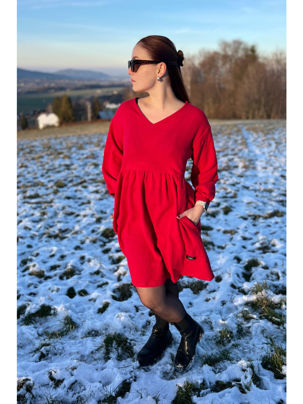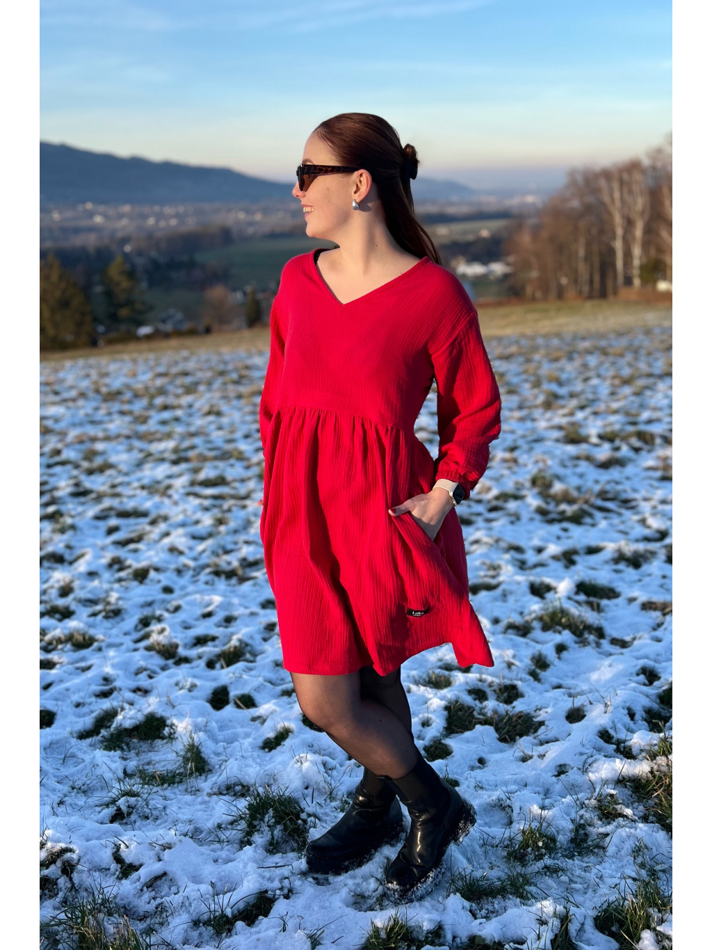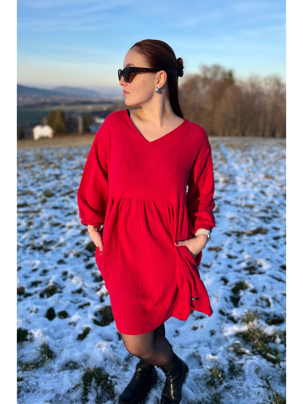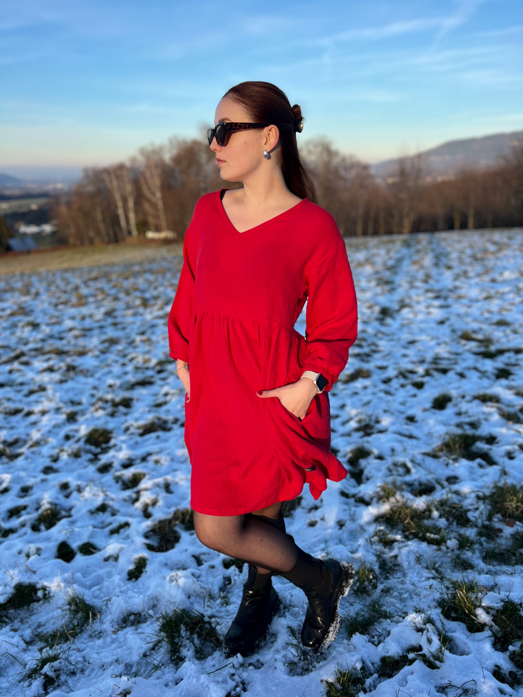 Tyto šaty jsou zkrátka láska na první pohled. Dotek materiálu Vám to jen potvrdí, je lehoučký, vzdušný a opravdu neskutečně příjemný. Tentokrát jsme volili výstřih do V, který k tomuto střihu šatů sedí parádně. Pokud jej ale chcete změnit, není problém pro Váš šaty ušít i s kulatým výstřihem. Nezapomněli jsme ani na oblíbené kapsy.