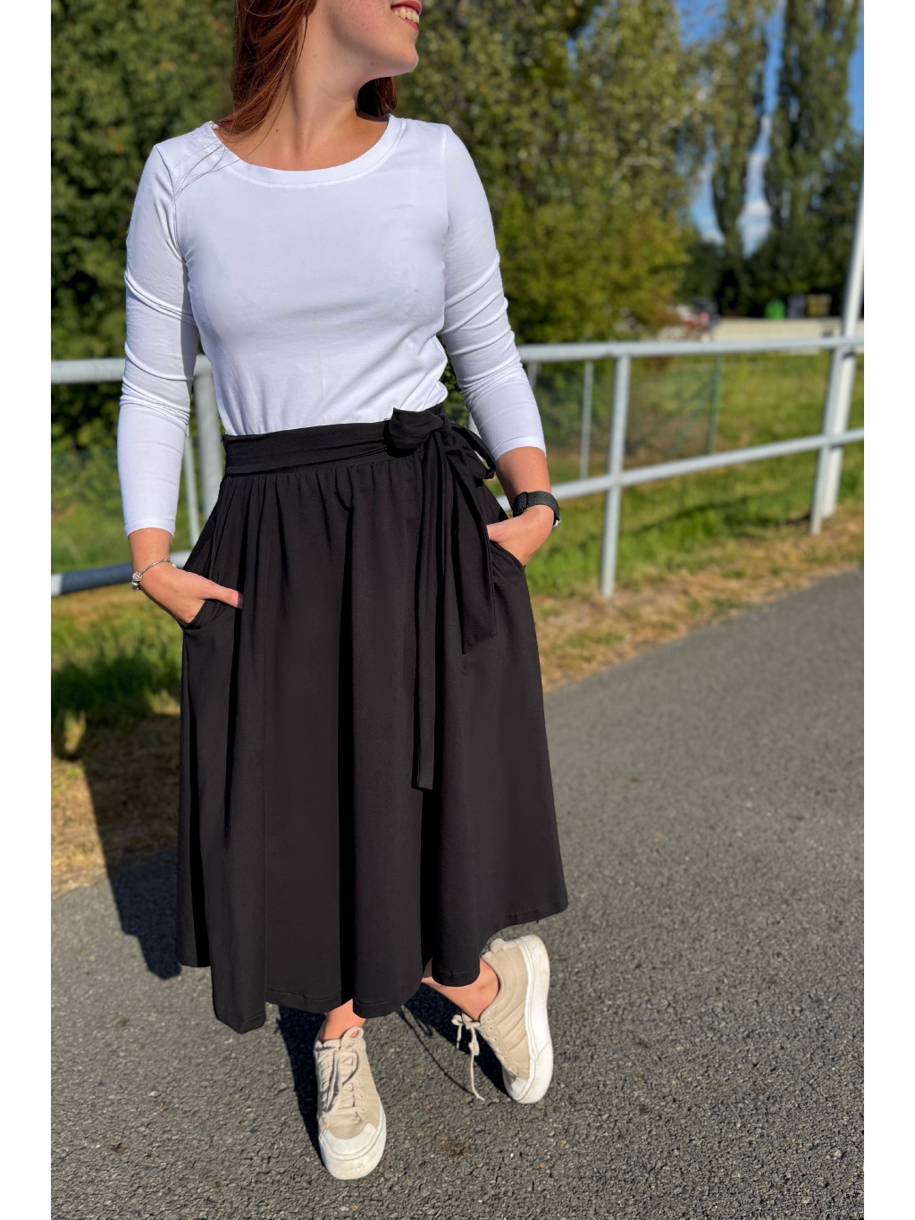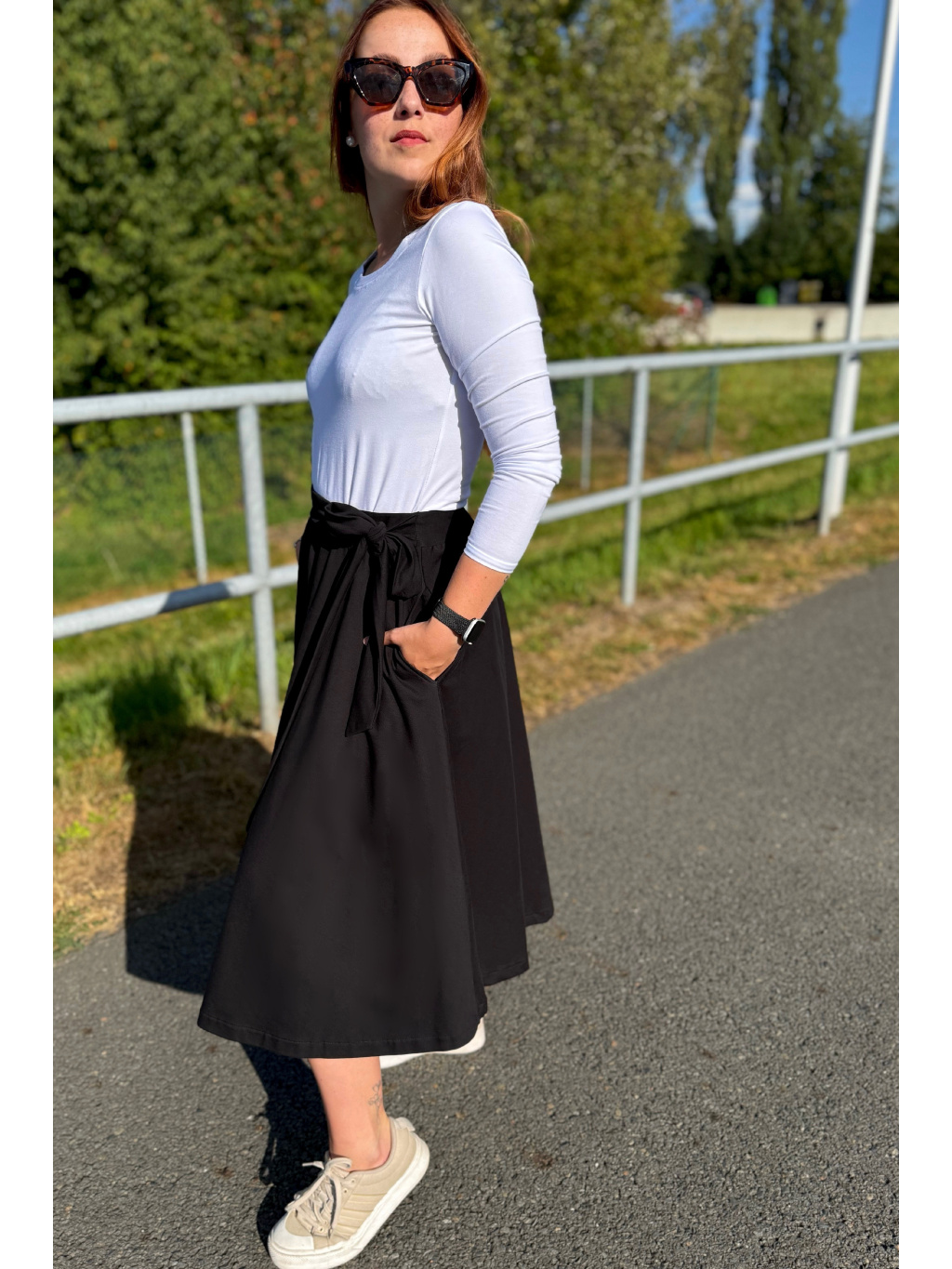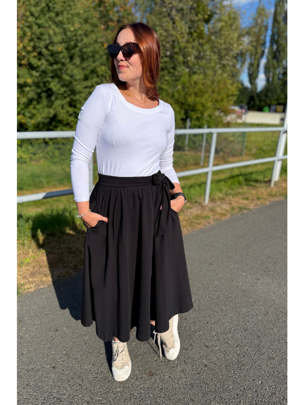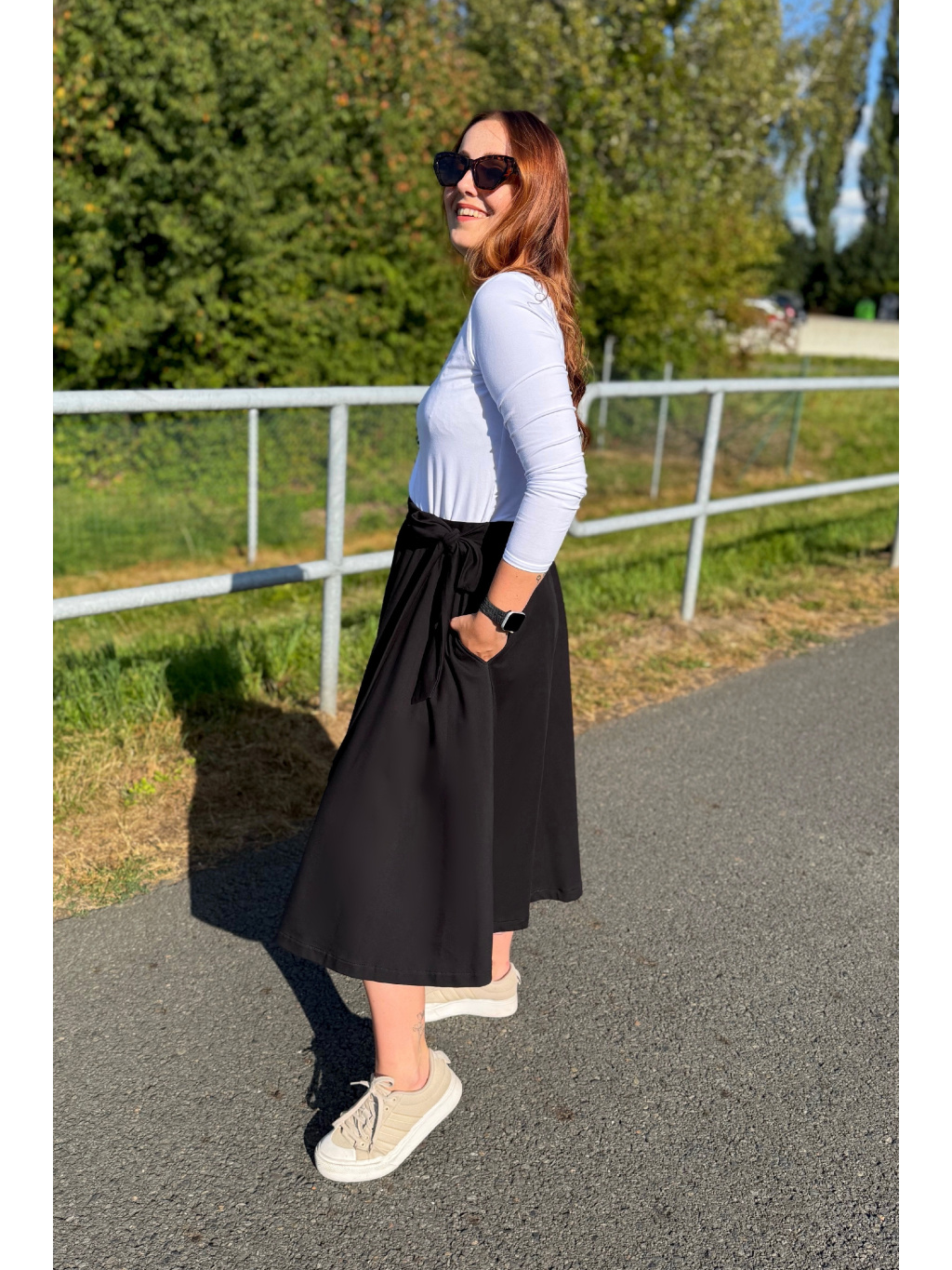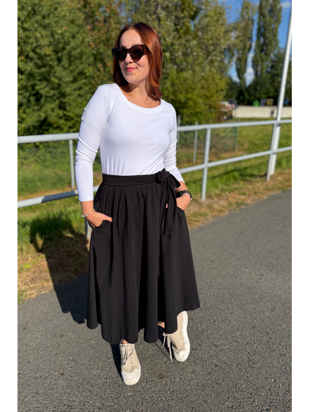 Elegantní, a přitom maximálně pohodlná – to je naše sukně Aurora. Skvěle ji sladíte jak s teniskami, tak s podpatky, a díky její univerzálnosti si ji rychle zamilujete. V pase má pružnou gumu a elegantní vázačku. A pokud si potrpíte na pohodlí, stejně jako já, určitě oceníte praktické kapsy po stranách.