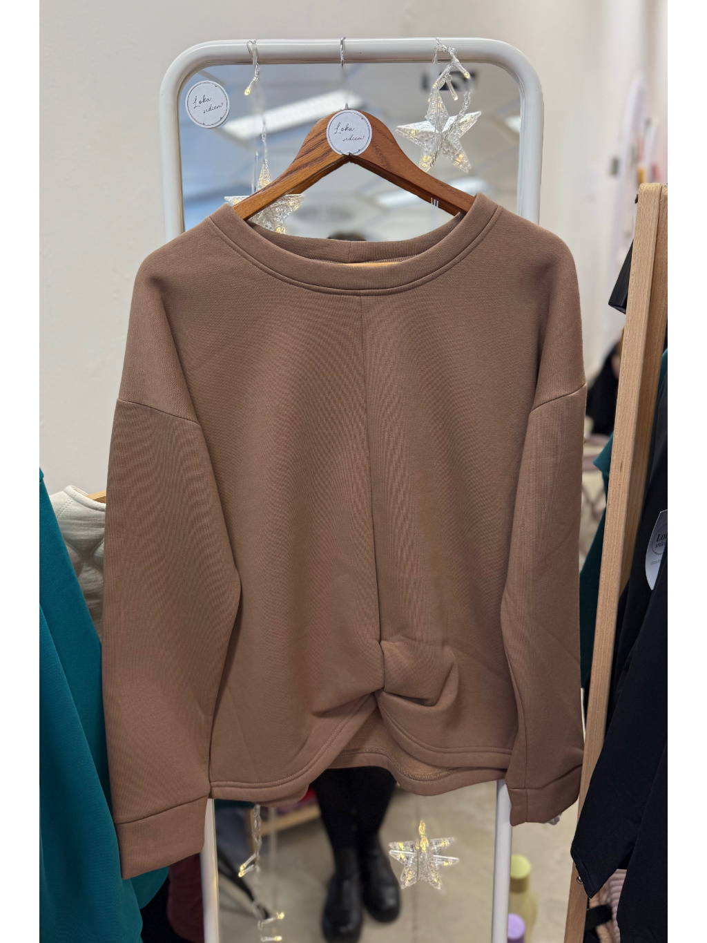 Střih zůstává pohodlný a lichotivý – přes prsa je volnější, směrem k pasu se lehce zužuje. Spadnuté rukávy a originální přední propletení dodávají mikině jedinečný charakter.