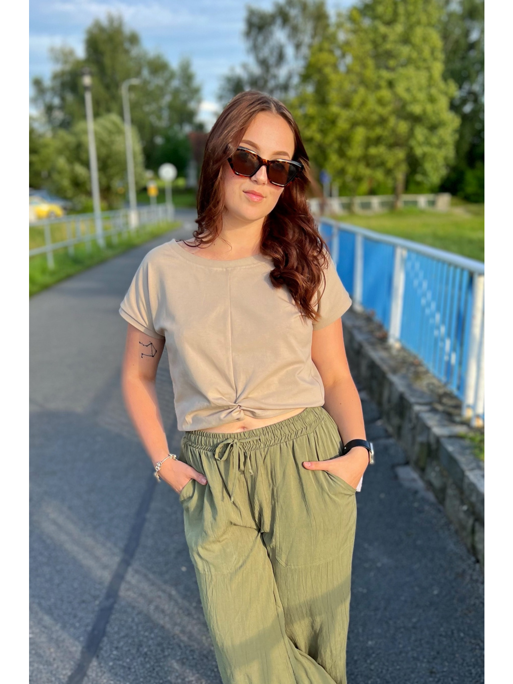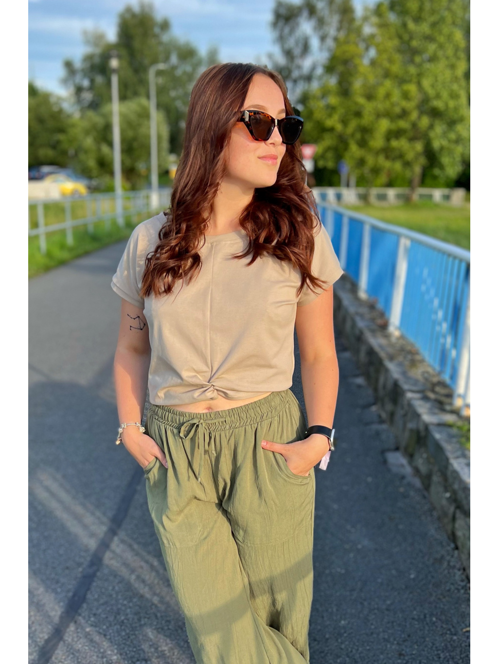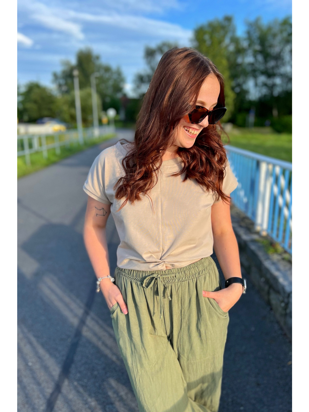 Toto triko jste si za rychle zamilovaly a není se čemu divit. Skvěle se hodí k sukním, kalhotům i kraťasům do pasu. Přes prsa je volnější a směrem k pasu se zužuje, má spadnutý rukáv. Kratší je u pupíku, kde je propletení, po stranách a vzadu je delší. Ušili jsme jej velmi příjemné biobavlny s certifikací GOTS.