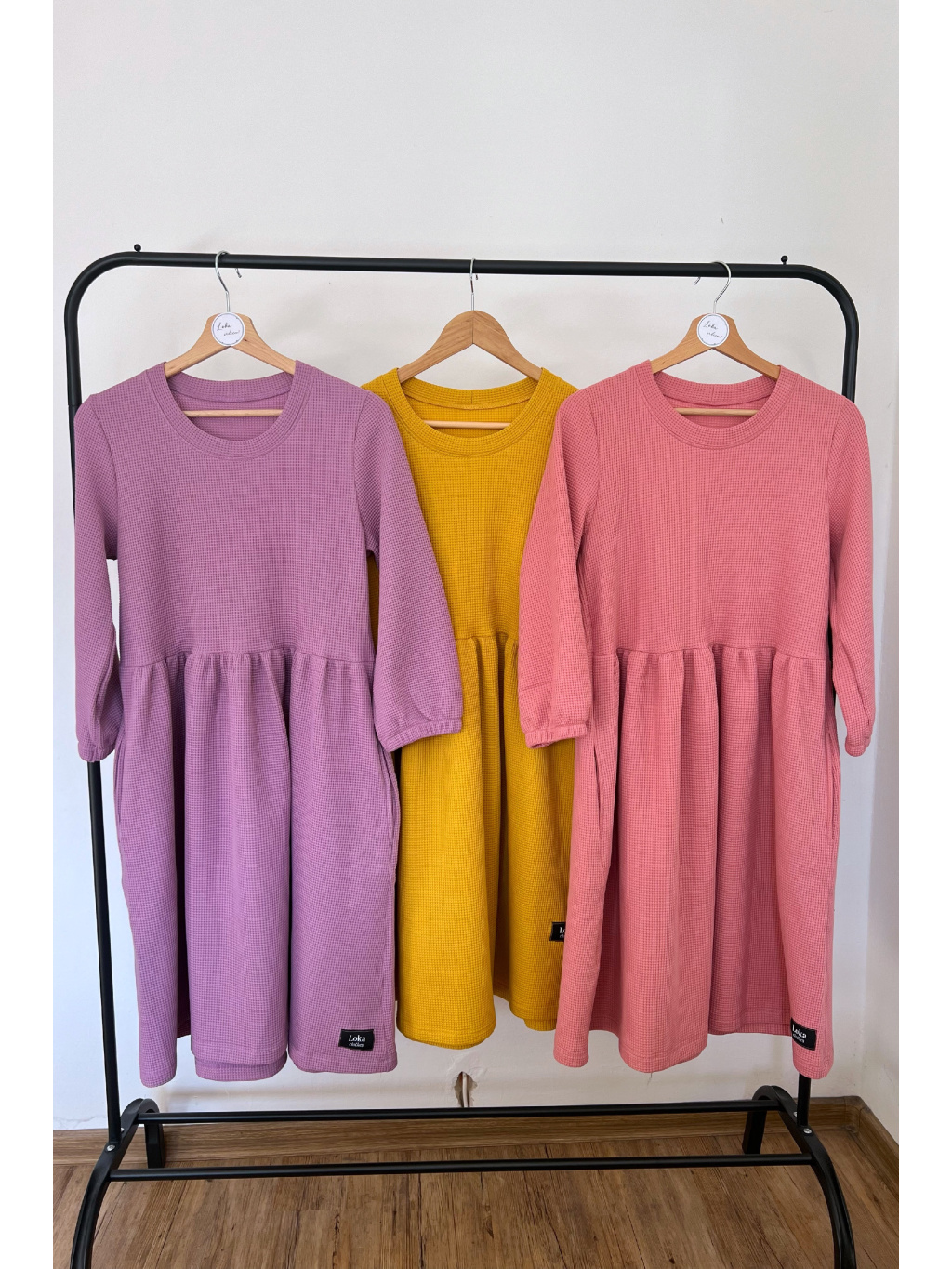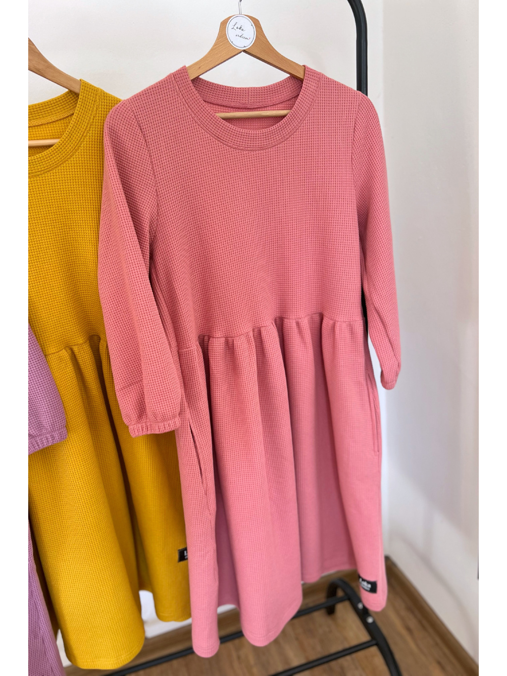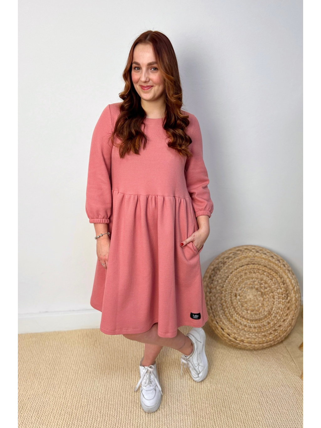 Šaty Anne jsou synonymem pohodlí pro každý den. Měkký vaflový úplet se jemnou strukturou se krásně přizpůsobí tělu a pohybu, rukávy s volnou gumičkou a praktické kapsy přinášejí svobodu a funkčnost.