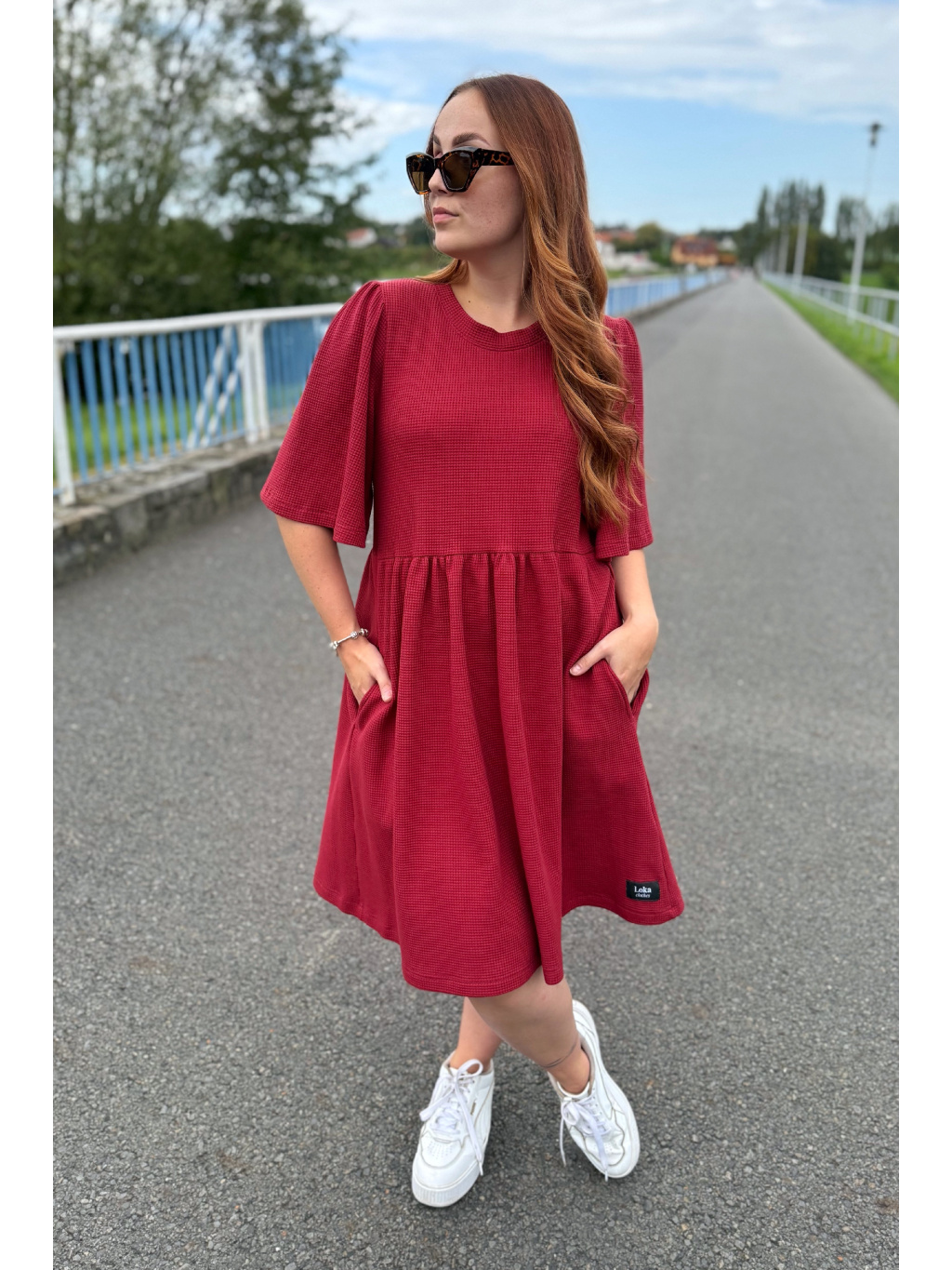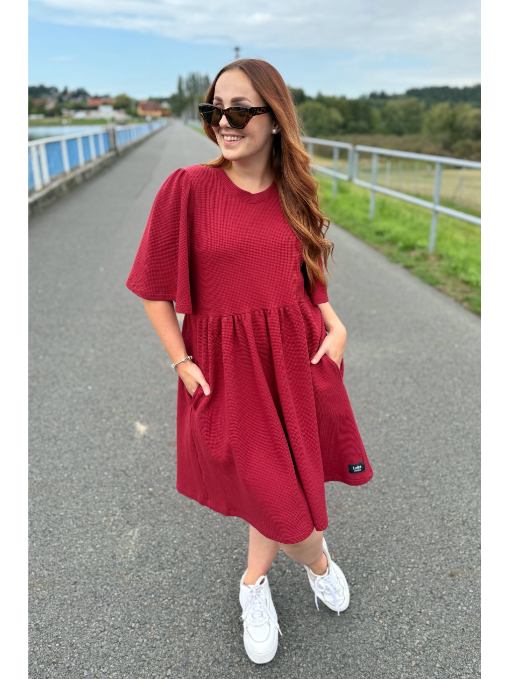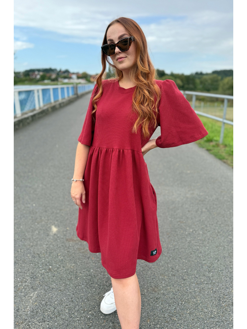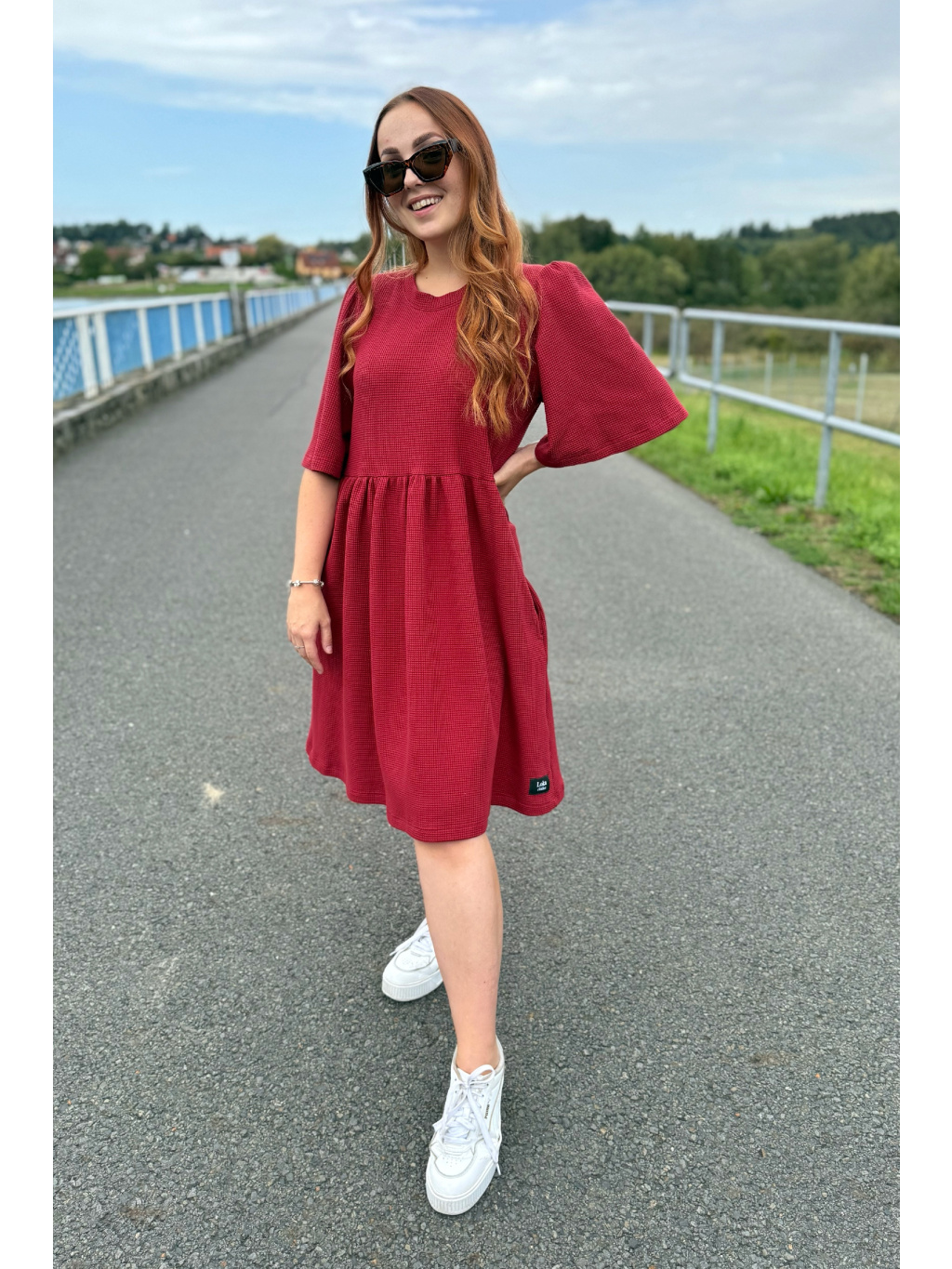 Šaty Vám na přání můžeme ušít také s propínáním (můžete vidět u vaflových šatů Anne ve vínové barvě).