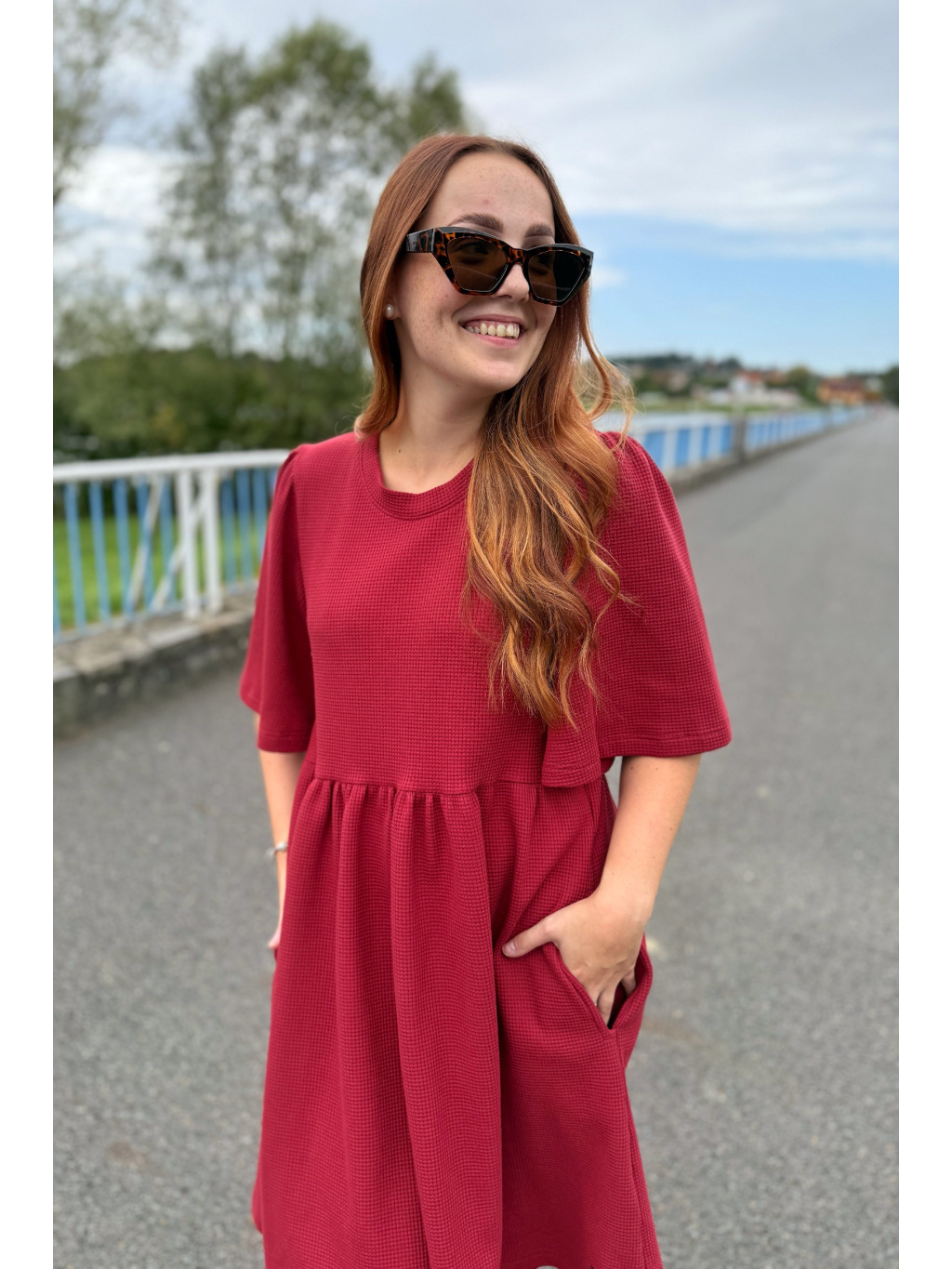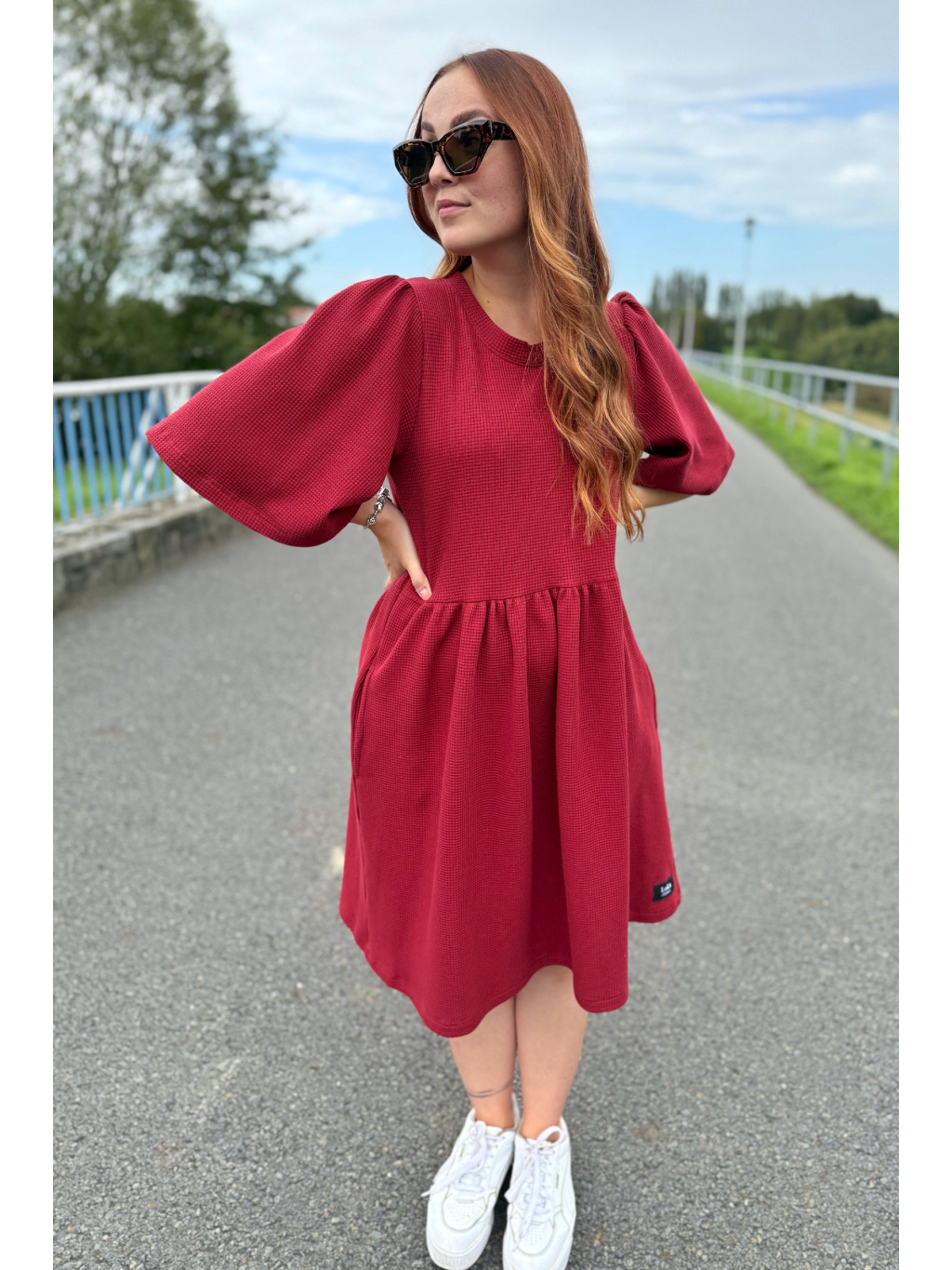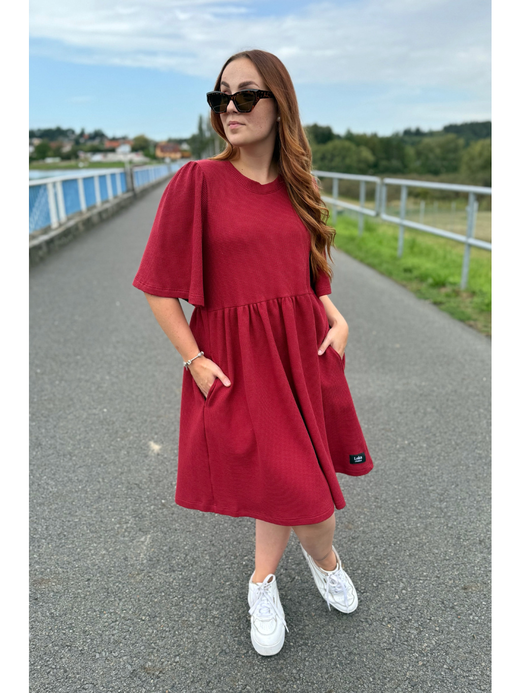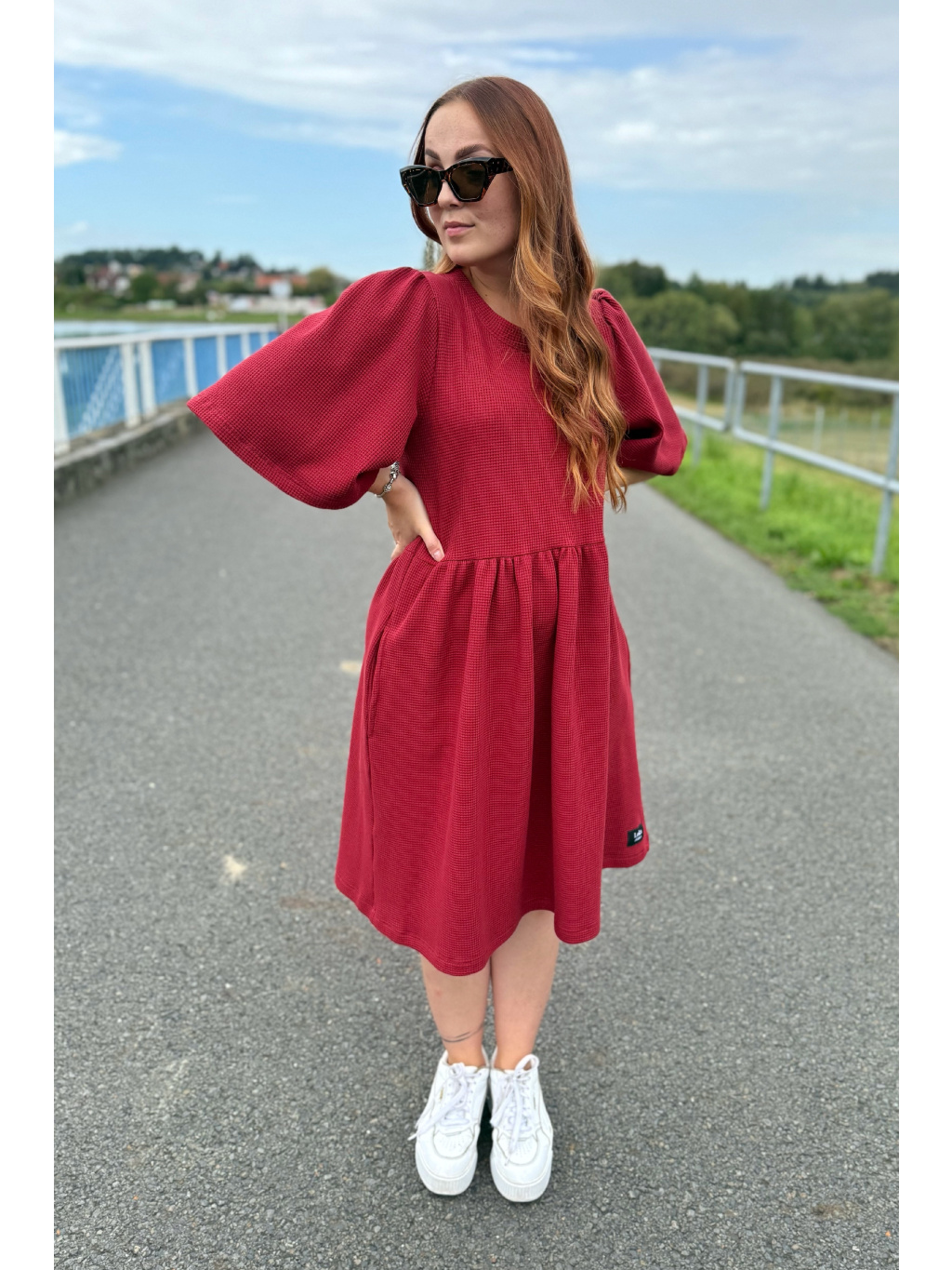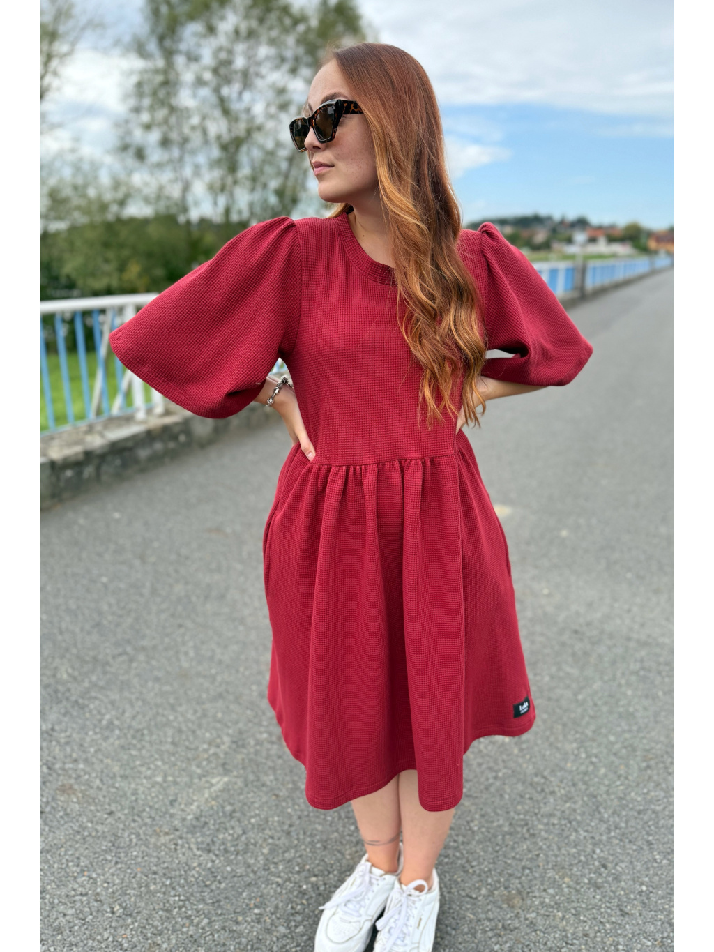 Šaty Vám na přání můžeme ušít také s propínáním (můžete vidět u vaflových šatů Anne ve vínové barvě).
