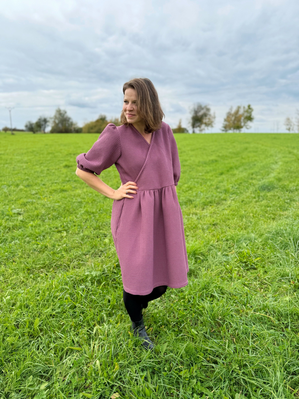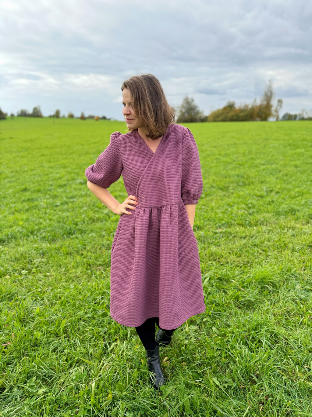 Zavinovací střih přirozeně zvýrazní pas a lichotí postavě, nadýchané rukávy dodávají eleganci a lehkost.