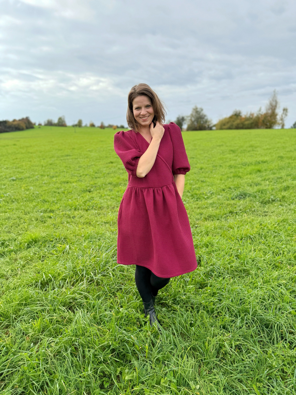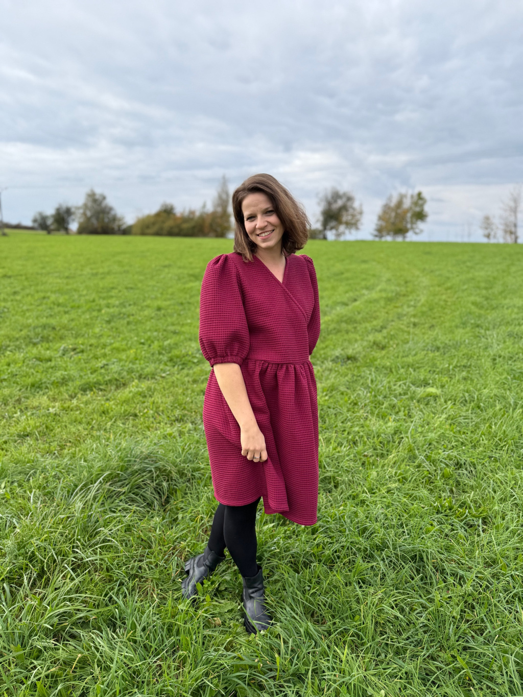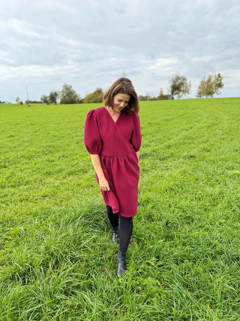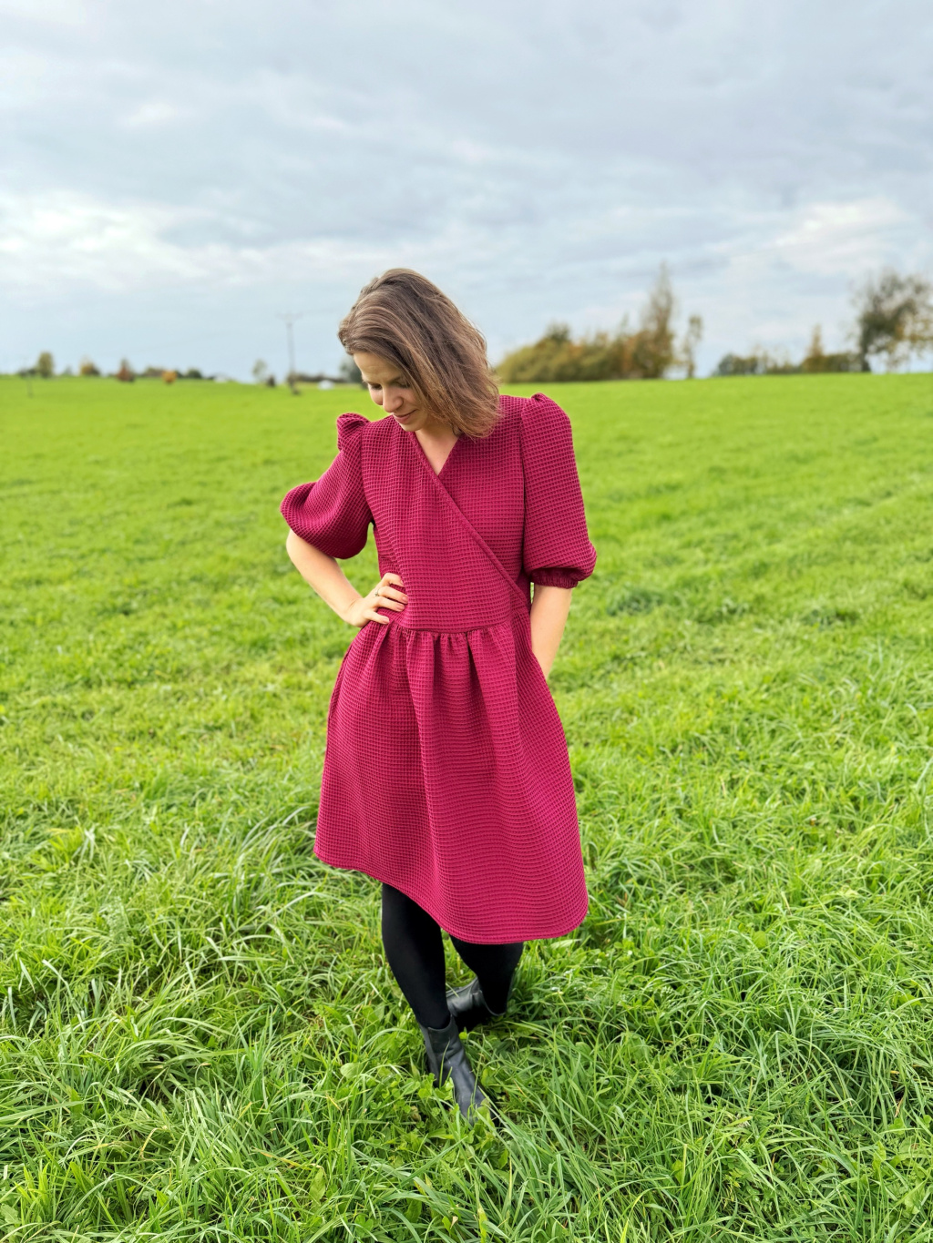 Zavinovací střih přirozeně zvýrazní pas a lichotí postavě, nadýchané rukávy dodávají eleganci a lehkost.